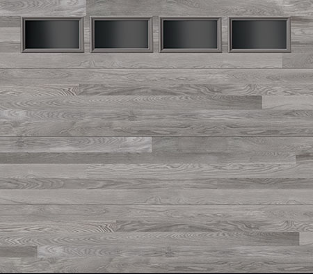 The printed horizontal plank design on a ribbed section creates depth, texture and subtle dimension. A perfect complement to modern, mid-century modern, and traditional architectural styles.  Features a multi-tone, digitally printed woodgrain surface with a more realistic wood look. Available with either traditional or Mosaic Window placement.  Choose from standard Short Panel or Long Panel windows with color matched frames or the new SlimLine window with Black frame.